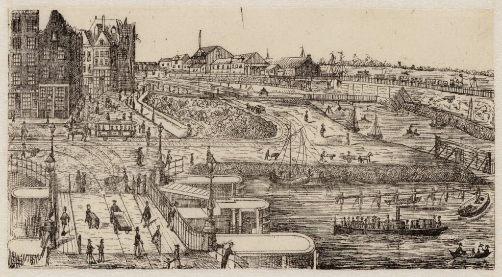 - Het Open Havenfront gezien uit oostelijke richting voor de bouw van het Centraal Station (1881). Steendruk (Stadsarchief)